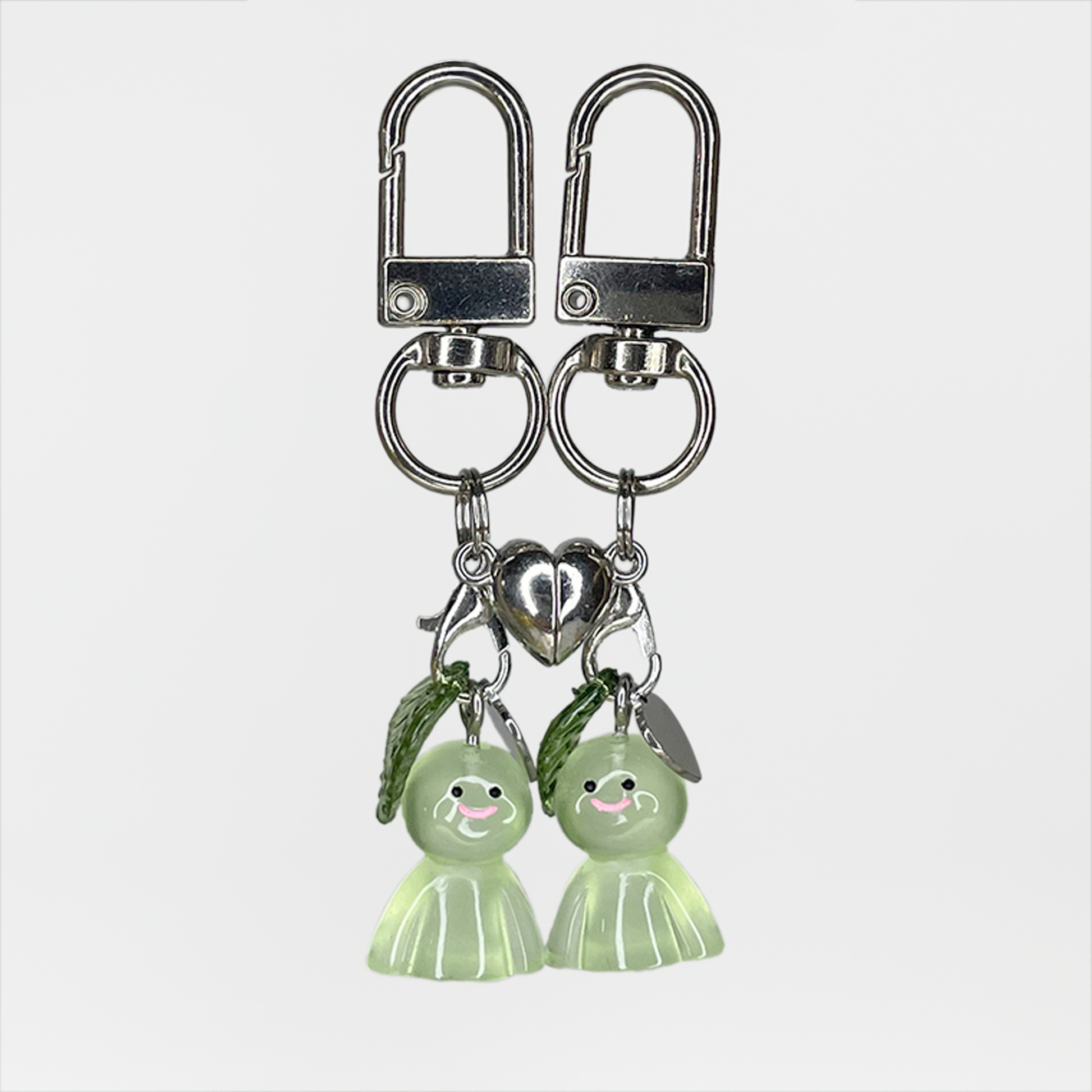 Details: These little green men glow in the dark and each feature a heart with you and your person's initial! The magnetic heart halves click together when placed close.